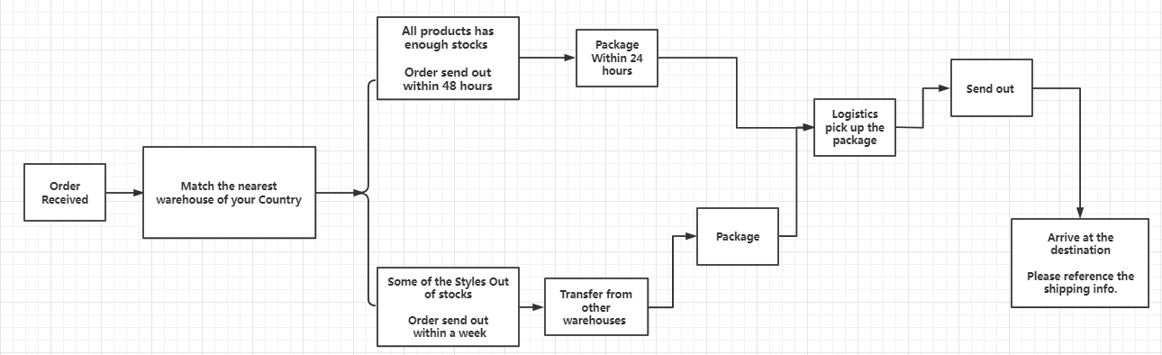 We match the nearest warehouse of your Country and if there's enough stocks - order send out within 48 hours